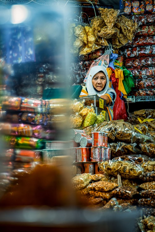 Title: The lady seller of Pasar Payang waiting for her first customer